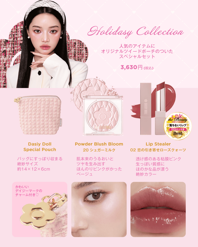 デイジードールの人気アイテムの特別セットをホリデーシーズン限定で発売!お出かけやパーティーにぴったりなツヤ感メイクアイテムを厳選!普段使いもOKな儚げニュアンスカラーアイテムと限定のオリジナルポーチもついた特別なコレクションです。