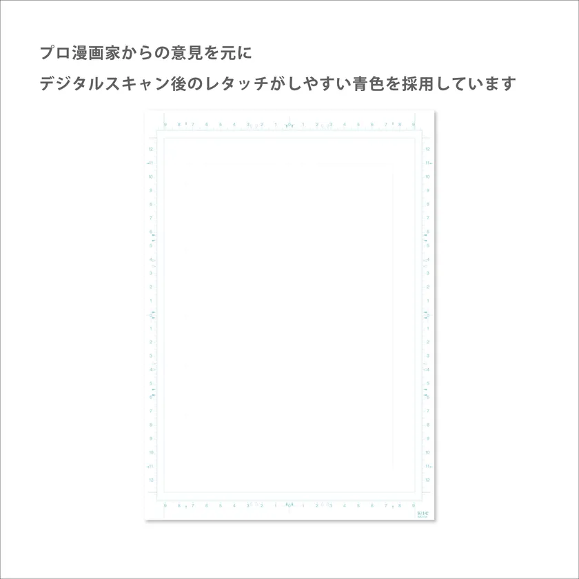 「アイシー漫画原稿用紙デジ(Desi)」はプロ漫画家、ユーザーのみなさまからのヒヤリングをもとに、漫画原稿をデジタルスキャンした後のレタッチ作業をしやすい薄い青色の枠線を採用した漫画原稿用紙です。1980年代よりユーザーの皆さまにご愛用いただいているアイシー漫画原稿用紙と同じく、用紙は原材料から選び、漫画に最適な紙を開発したアイシーオリジナルの特別な白上質紙です。