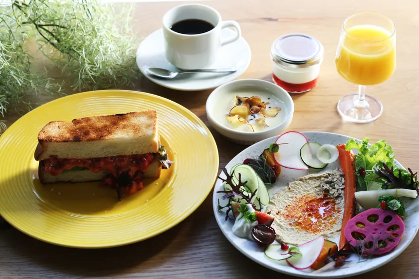 炭焼でじっくり香ばしく焼き上げるトーストに京都エッグとビーツをあわせた「京都エッグと根菜ビーツサンド」に、季節の旬のお野菜や果実、ハーブやフムスなどを組み合わせたこだわりの前菜、季節のお野菜スープと発酵果実ヨーグルトが付きます。更に朝時間をゆっくり楽しんでいただくために自家焙煎珈琲やフルーツジュース、アールグレイなどがドリンクフリーです。