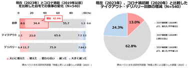 また、自宅での食事の実態として、現在とコロナ禍前を比較すると「自炊」は42.4%、「テイクアウト」は24.1%、「デリバリー」は12.1%増えました。なお、物価上昇を続ける現在とコロナ禍初期を比較すると、テイクアウト・デリバリーの回数は「増えた/やや増えた」が13.0%に対し「減った/やや減った」が24.3%と11.3ポイント高い結果になりました。