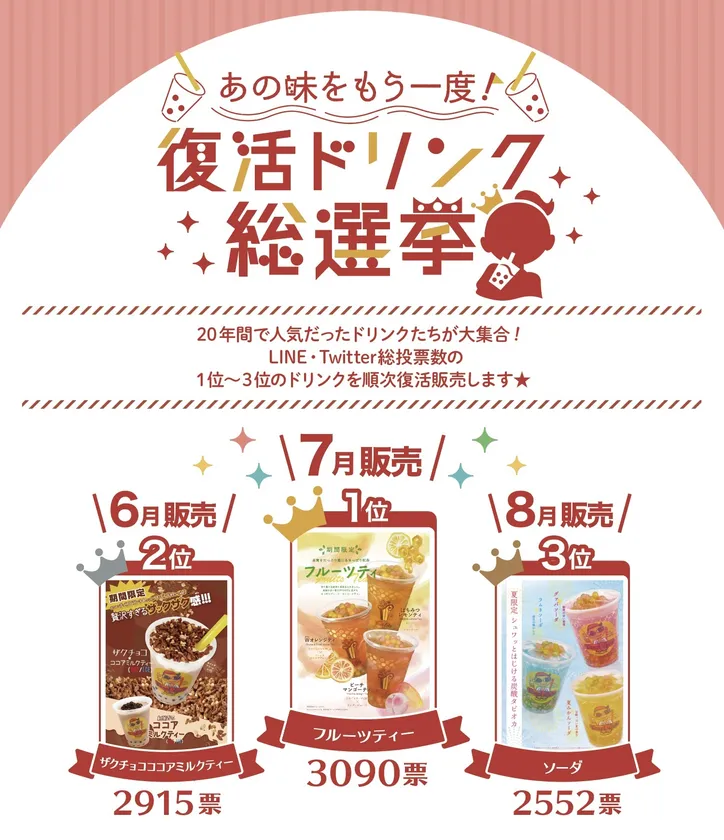 過去にパールレディで販売した限定商品の中から8商品をピックアップ。2023年3月にお客様に投票いただき上位3商品を復活ドリンクとして販売。