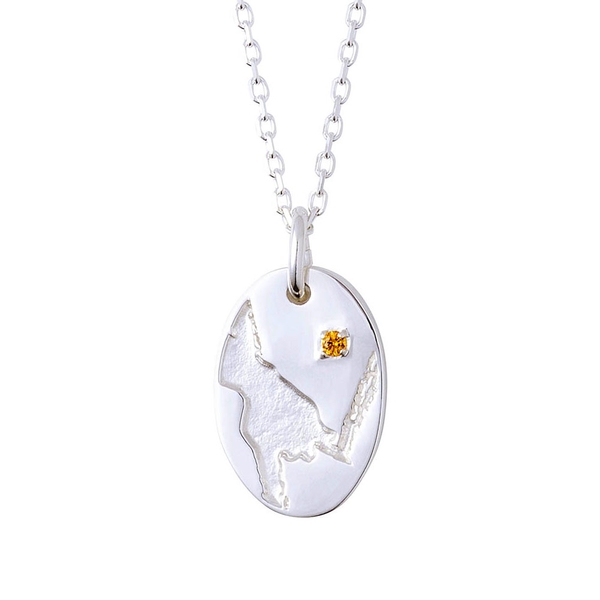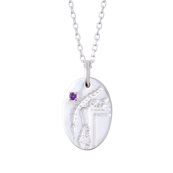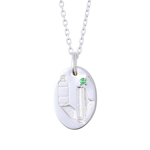 オーバルタイプのプレート表面には、力強い手のシルエットと木炭のストロークを表現し、イメージカラーストーンをセット。裏面にはつなぎのシルエットと名前を刻印。