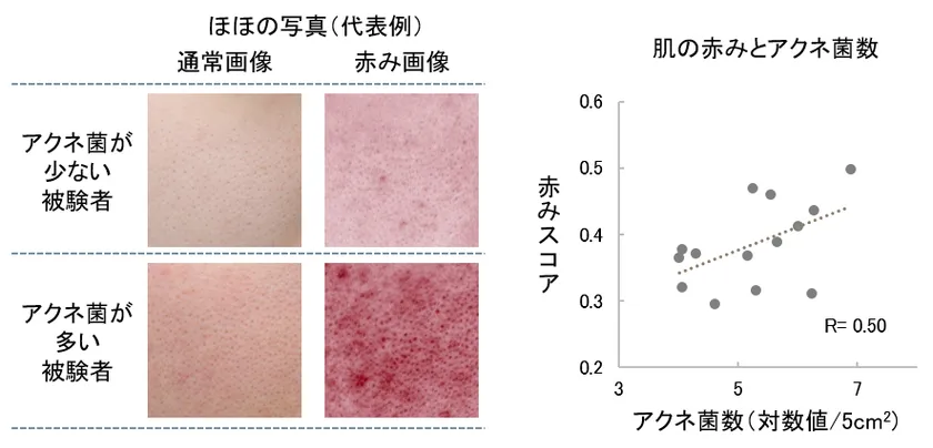 健常女性14名(20代~40代)のほほを対象とし、綿棒を用いた拭き取り法によって皮膚常在菌のサンプリングを行い、PCR法※1を用いてアクネ菌数の測定を実施しました。また、肌の赤みについては、顔写真よりほほ部の赤みの強さ(赤みスコア)を算出しました※2。