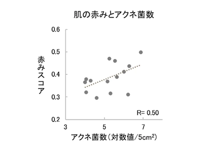 その結果、肌の赤みが強い人はアクネ菌の数も多くなる傾向がみられました(図1)。すなわち、アクネ菌の数が肌の赤みに関与していると考えられました。