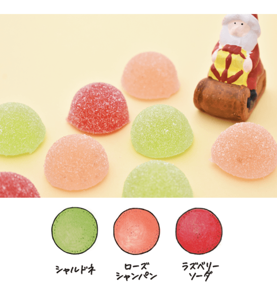 酸味を効かせたヨーグルトチョコレートにシャンパンをアクセントに加えた新作のグミチョコ。中のバブレッツ(ゼリーグミ)はラズベリーソーダとシャルドネフレーバー。見た目も味わいもクリスマスにぴったりです。