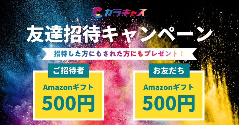 お友達をカラキャスに招待し、招待したお友達がカラキャスに登録すると、招待した人とされた人、両方にAmazonギフト券500円分をプレゼント!招待可能人数は無制限!
