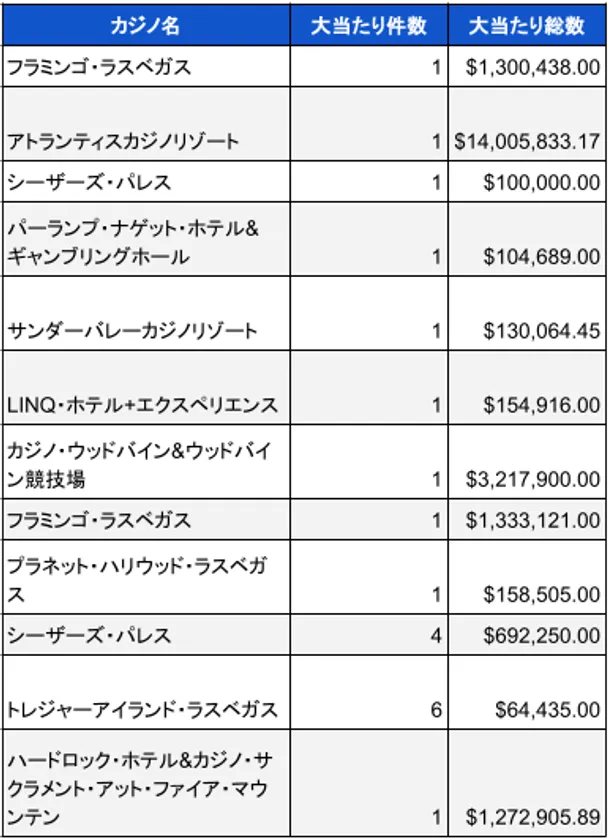調査期間中の最大当選額は、2023年4月に当選があったアトランティスカジノリゾートの14,005,833ドル(日本円で約19億円)です。