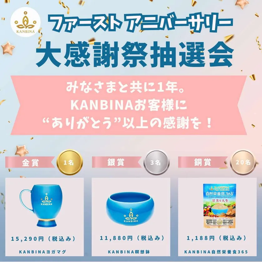 KANBINA「自然栄養食365」発売から1周年を記念し、2022年6月21日から2023年6月30日の1年間、「自然栄養食365」を含むKANBINA商品を愛用して頂いたお客様に感謝の気持ちを還元するために「KANBINA大感謝祭り抽選会」を企画しました。KANBINAヨガマグ、瞑想鉢、自然栄養食365などのオリジナル商品を24名様にプレゼントいたします。