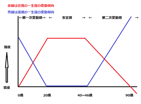 下のグラフをイメージした上で、自分が今後どう変化するのを読み取り、対策を練るべきです。例えば第一次変動期では近視の継続的な進行が予想されますから、変動期に手術をしても更に近視は進行してしまい、場当たり的になるでしょう。また安定期であっても、レーシック術後、40代からは遠視化する可能性がある事を考慮し、多少の近視程度に弱めた度数調整を推奨します。増してや老眼真っただ中の50歳以降の世代であれば敢えて近視を残して、老眼対策を予め策を講じておくのです。何故なら多少の近視を残しておけば本当に細かい物以外は手元に不自由なくご覧になれます。