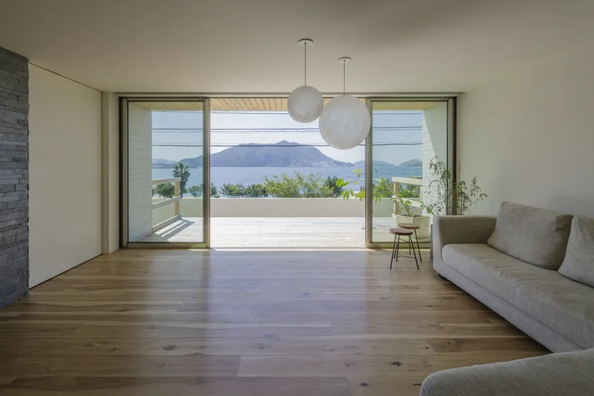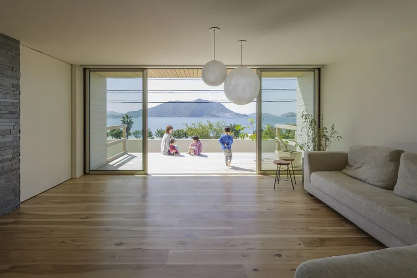 家族がいつも一緒にいられるリビングを南の海側に設け、幅5メートルの開口窓を設置。海と島を一度に望める贅沢な眺望が特徴で、余計なものは加えず、見せない工夫もされています。高さを抑えた天井はダウンライトなども出ていないため、視線が自然と海へ導かれます。