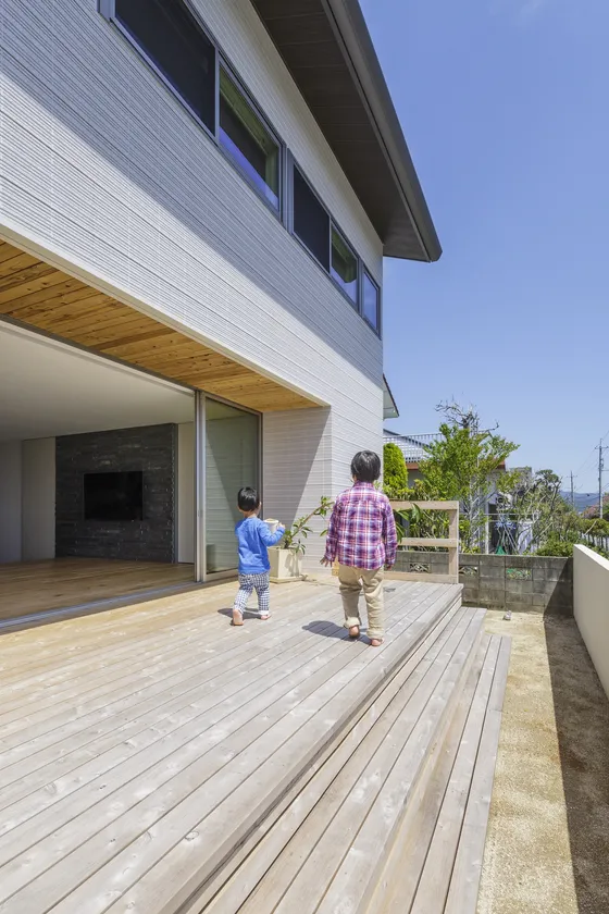 また、リビングからフラットに続くデッキはあえて南側ぎりぎりにせず、地面までを階段状にすることで、転落防止の塀の高さを抑え絶景を堪能できるようにしています。