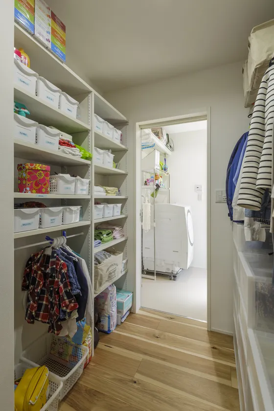 洗濯室の隣にウォークインクローゼットを設置し、衣類収納の動線を最短に