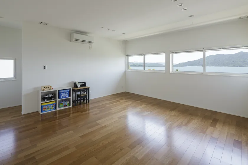 あらかじめ天井を補強してあり、南面に2つ設置した窓の間で空間を仕切ることができます。どちらの個室からも、海と島を眺められる設計です。