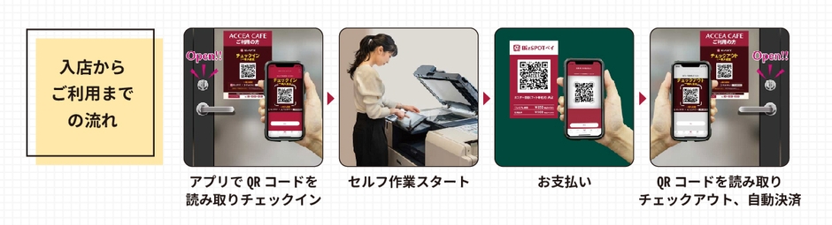 事前にアプリのダウンロード、会員登録をお願いいたします。またセルフアクセアご利用にはアクセアカフェへのチェックインが必要です。