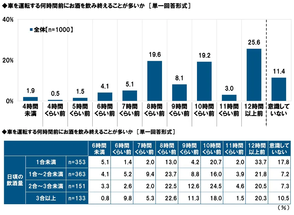 全回答者(1,000名)に、車を運転する何時間前にお酒を飲み終えることが多いかを聞いたところ、「12時間以上前」(25.6%)が最も高くなり、次いで、「8時間くらい前」(19.6%)、「10時間くらい前」(19.2%)となりました。