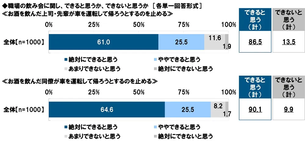 お酒を飲んだ上司・先輩または同僚が車を運転して帰ろうとするのを止めることができると思うかを聞いたところ、【上司・先輩】に対しては、『できると思う(計)』は86.5%、『できないと思う(計)』は13.5%となり、【同僚】に対しては『できると思う(計)』は90.1%、『できないと思う(計)』は9.9%となりました。