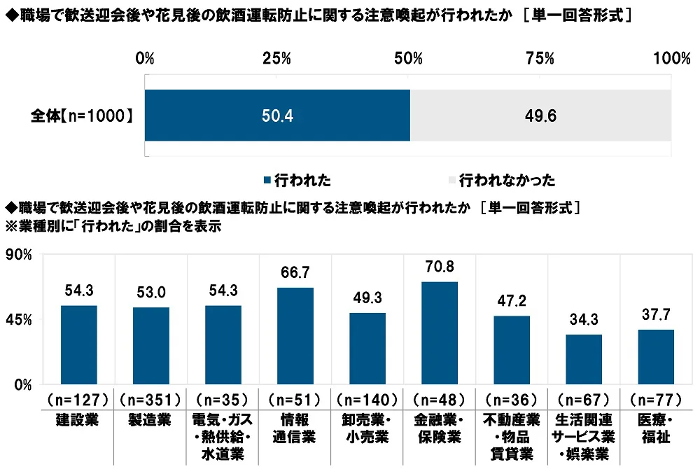 全回答者(1,000名)に、自身の職場で歓送迎会後や花見後の飲酒運転防止に関する注意喚起が行われたかを聞いたところ、「行われた」は50.4%、「行われなかった」は49.6%となりました。新型コロナ関連の規制緩和によって、対面での歓送迎会や花見といったイベントを行うようになった企業では、あらためて飲酒運転防止に関する注意喚起を行ったケースがあるのではないでしょうか。