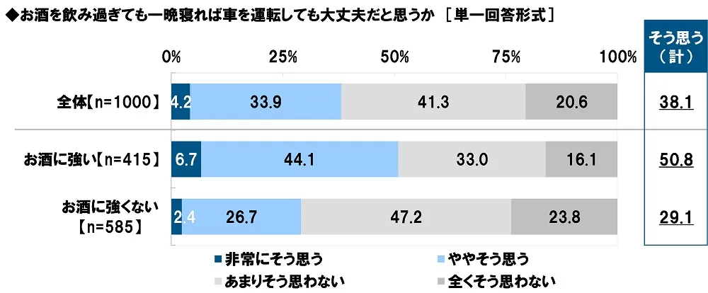 ■「お酒を飲み過ぎても一晩寝れば運転しても大丈夫だと思う」約4割、お酒に強いと自負している人では5割