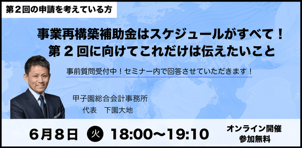 事業再構築補助金[2回目]の申請を考えている方へ 創業融資の専門家が基本から申請まで時系列で解説する オンラインセミナーを6月8日(火)に開催!