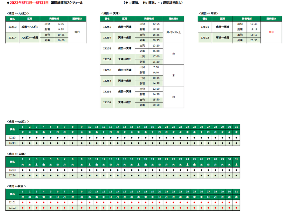 2023年5月26日 13:00スプリング・ジャパン株式会社(本社:千葉県成田市、代表取締役社長:米澤 章、以下:スプリング・ジャパン)は、2023年6月~8月の成田=寧波線の運航および成田=新千歳線の増便を以下のとおり決定し、本日5月26日(金)15時より、販売を開始いたします。