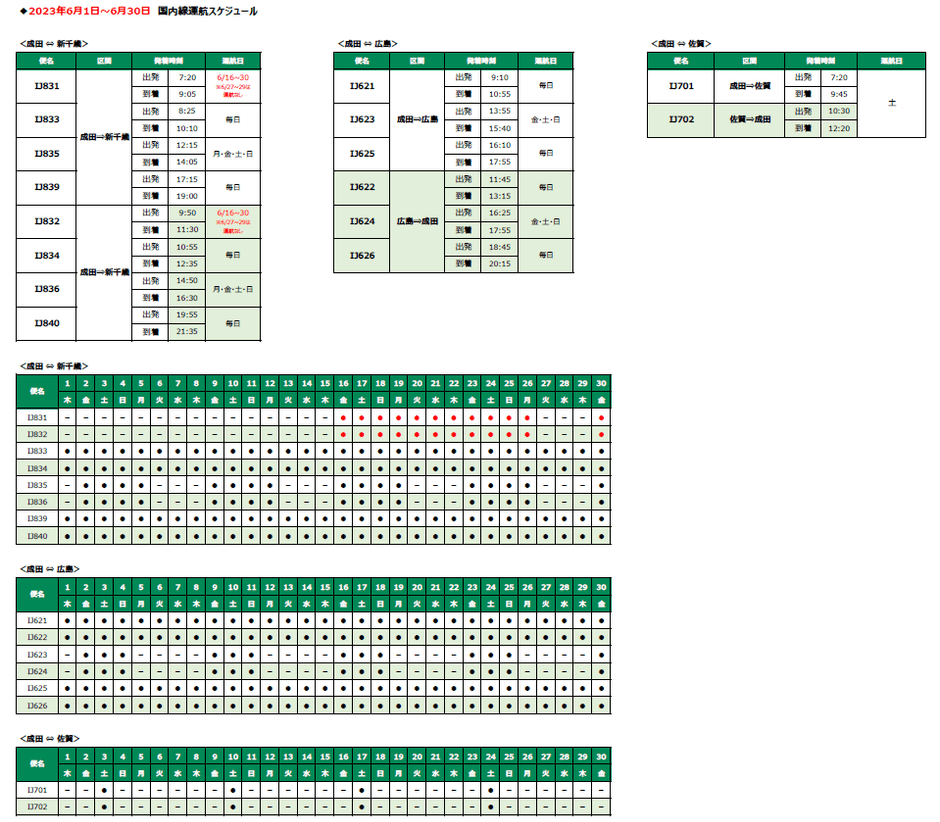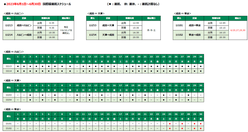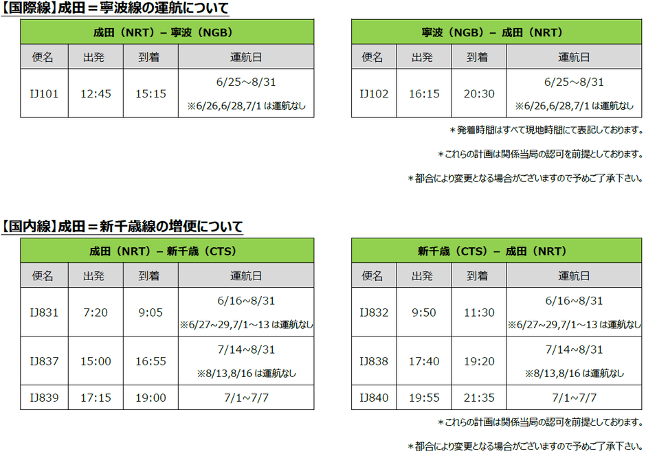 スプリング・ジャパン株式会社(本社:千葉県成田市、代表取締役社長:米澤 章、以下:スプリング・ジャパン)は、2023年6月~8月の成田=寧波線の運航および成田=新千歳線の増便を以下のとおり決定し、本日5月26日(金)15時より、販売を開始いたします。