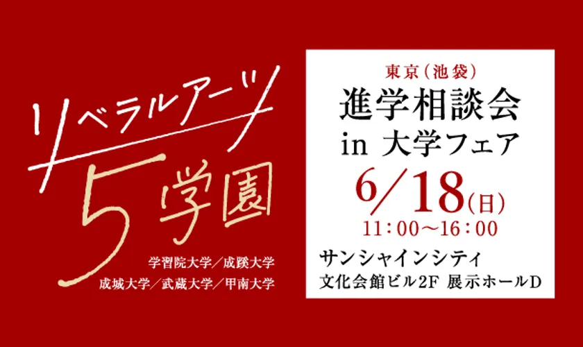 学習院大学・成蹊大学・成城大学・武蔵大学・甲南大学の5大学で構成される「リベラルアーツ5学園」は、旧制高等学校をルーツに持ち、現在も総合的な人間力を養うリベラルアーツを実践しているのが特長です。この5学園が、2023年6月18日(日)、今年で36年目を迎える大学進学相談会「大学フェア」にて、「リベラルアーツ5学園 進学相談会 in 大学フェア2023」を開催します。