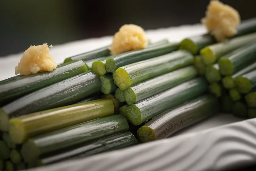 西和賀一の特産品「西わらび」。その中でも特に太く長く、整備された特別な畑でのみ栽培された「黒系」とよばれる西わらびが『黒わらび』です。西わらびの父と呼ばれる小田島 薫氏が直接管理している畑から収穫したもののみを使用しており、通常西わらびはシャキッとした食感のものが多い中で、とても柔らかな歯ごたえとしっかり感じる粘り気が特徴的です。