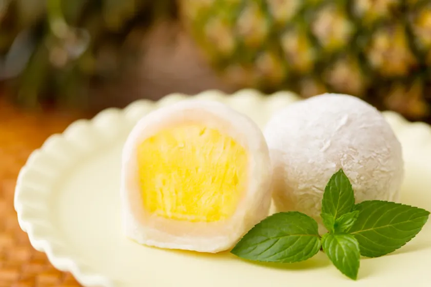 ジューシーではじけるようなパイナップルの味わい。ひとくち頬張れば南国の甘い香りが口いっぱいに広がります。大福の上品で柔らかな「和」の味わいと、南国の風感じるフルーツ・パイナップルが織り成す芳醇な美味しさをどうぞご堪能ください。