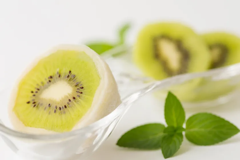 爽やかで甘酸っぱい美味しさが魅力のキウイフルーツ。新鮮で瑞々しい果肉をきめ細かくさらりとした自家製白あんとふんわり柔らかなお餅で包みました。旬の美味しいさが溢れ出す至福の逸品です。