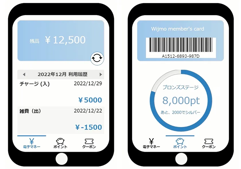 電子マネー、ポイント、クーポンの3つのタブで構成されており、FlexGridやFlexChart、MultiRowといったWijmoの複数のコントロールを使用して、月々の支出データ、現在のポイント数、獲得ポイントの推移、各種バーコードなどを表示する機能を実装しています。