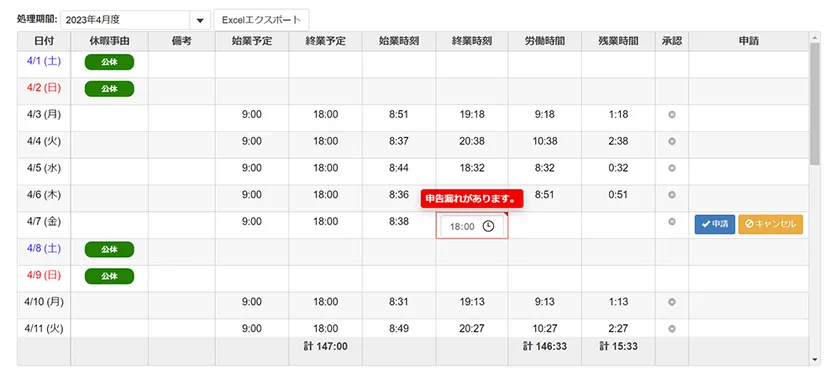 就業月報サンプル画面