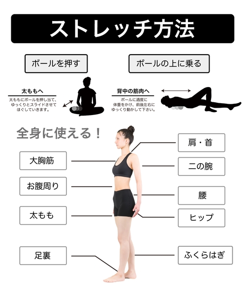 ほぐしたい場所にボールを押し当ててスライドさせたり、床に置いてボールに乗り適度な体重をかけながらスライドさせたりなど、全身にお使いいただけます。
