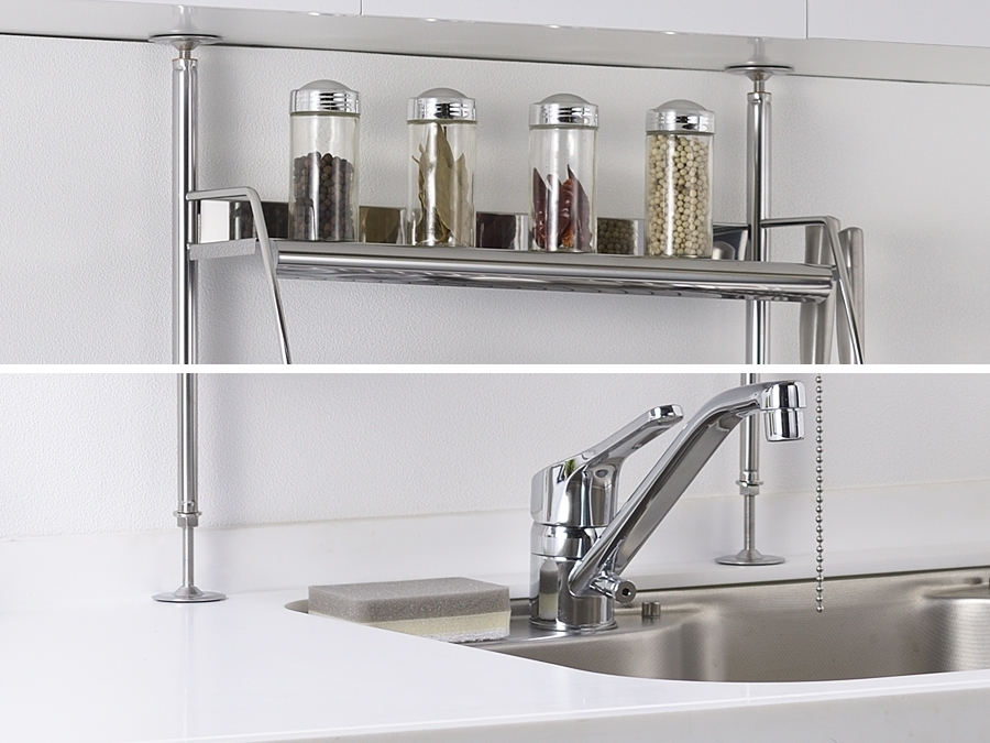 突っ張り構造 + 水が伝って流れるトレイで水捨て不要。 省スペースで多機能な水切りラックです。