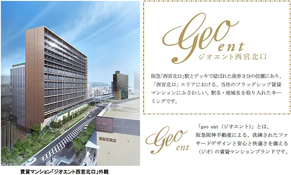 阪急阪神不動産株式会社は、阪急西宮ガーデンズ本館の西側において、地上14階建ての複合施設を建設しています。本複合施設の10階~14階部分に展開する、賃貸マンションの名称を「ジオエント西宮北口」(以下「本物件」)と決定しましたのでお知らせします。