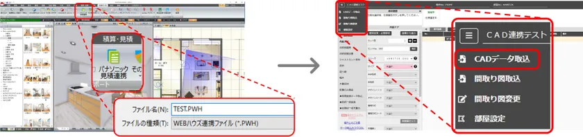 最新バージョンでは、パナソニック ハウジングソリューションズ株式会社が提供する「Webハウズ・間取り図積算システム」とのデータ連携が実現します。これにより、パナソニックの住宅設備建材の見積作成、図面出力、画像による提案ボード出力などの一次見積作成業務の簡易化・スピード化を実現し、DXが促進されます。