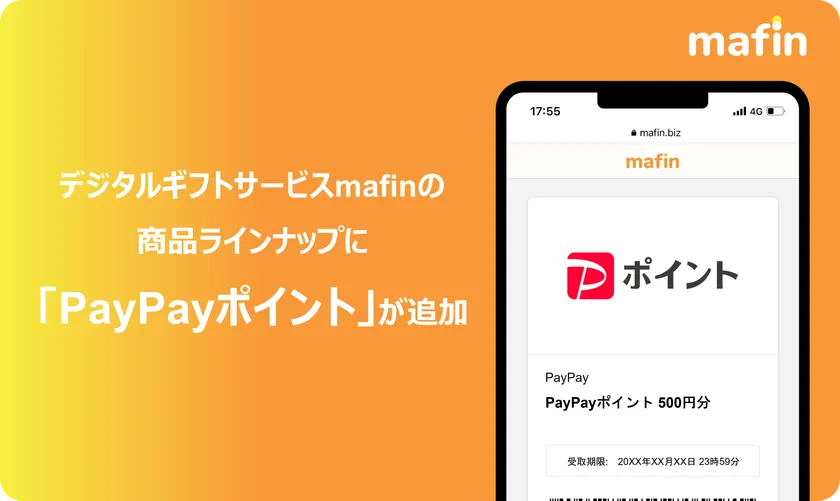 デジタルギフトサービス「mafin(マフィン)」を手掛ける株式会社マフィン(本社:東京都渋谷区、代表取締役社長:尹 喜重、以下、「当社」)は、2023年5月30日より、当社が提供するデジタルギフトのラインナップとしてキャッシュレス決済サービス「PayPay」の残高の一種である「PayPayポイント」の取り扱いを開始いたしました。