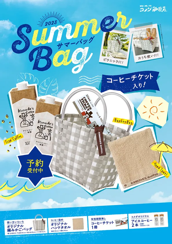 日頃ご愛顧いただいているお客様へ、感謝の気持ちを込めて「2023年サマーバッグ」をご用意いたしました!今年のサマーバッグのテーマは「コメダと過ごす夏の涼」。夏らしいオリジナルの編みかごバッグに、オリジナルアイテム1種類と、アイスコーヒー、コーヒーチケット1冊を詰め込んだ、とてもお得なセットです。各店舗数量限定での販売です。限定数に達し次第、予約受付及び販売を終了いたしますので、ぜひお見逃しなく。