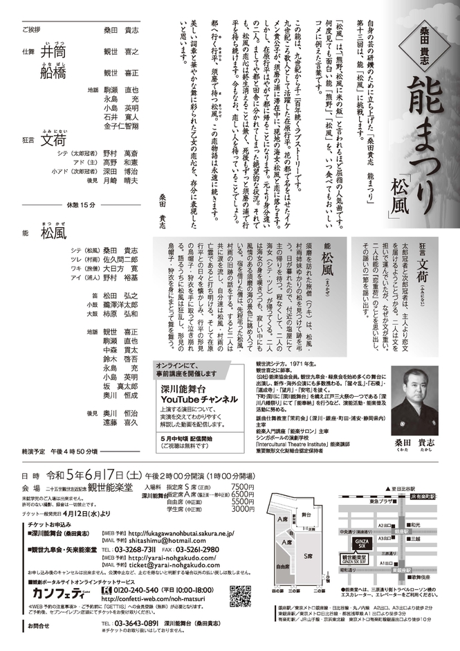 深川能舞台『桑田貴志 能まつり「松風」』が2023年6月17日 (土)に二十五世観世左近記念観世能楽堂(東京都中央区銀座6-10-1GINZA SIX 地下3階)にて上演されます。