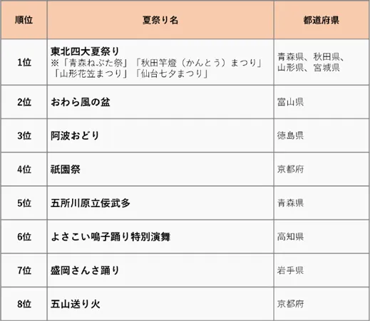 1位は「東北四大夏祭り」となりました。東北地方の各地で開催される大規模な4つの祭りを数日間で巡ることができるツアーが人気です。2位は富山県の「おわら風の盆」、3位は徳島県の「阿波おどり」です。6位「よさこい鳴子踊り特別演舞」は、規模縮小によって2022年だけ特別な開催となった、高知県のよさこい祭りのことです。