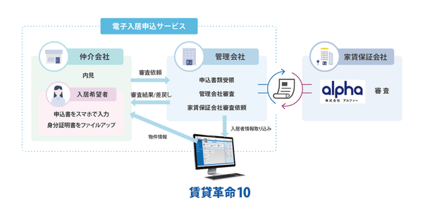 入居申込をオンラインで完結する日本情報クリエイトの「電子入居申込サービス」とアルファーが提携を行うことにより、家賃保証サービスをご利用いただく入居希望者様、仲介会社様、管理会社様はこれまでと比較して、手書きでの保証申込書作成の手間や記載漏れの確認などのストレスが少ない、スムーズな保証審査が可能となります。
