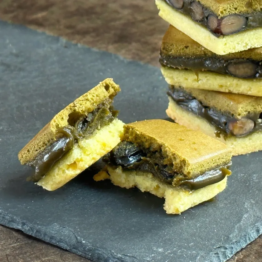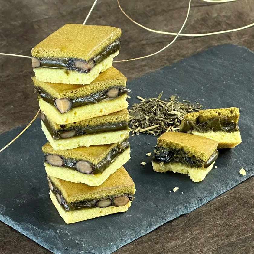 ほうじ茶を練り込んだ濃厚なキャラメルと黒豆をシュクセ生地とサブレ生地でサンドしたお菓子。