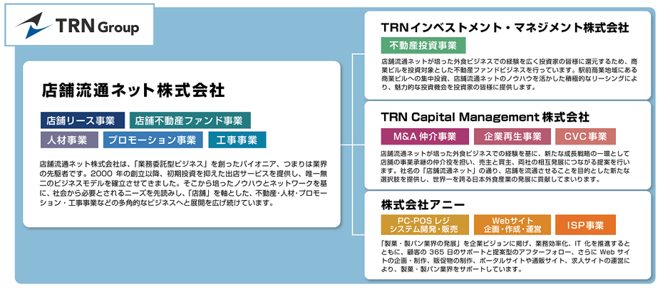 TRNグループは2000年の創業から、社会のニーズを先読みし、コーポレートスローガンである「明日の街、もっと楽しく。」の実現に向けて、店舗を軸に据えた事業領域で新たなビジネスに挑み続けています。店舗流通ネット株式会社を親会社とする3つの子会社が存在し、出店から退店までをトータルサポートする店舗総合支援事業、駅前商業立地の商業不動産を対象とした不動産投資事業、M&A仲介・企業再生・CVC事業、PC-POSレジシステム開発・販売・Webサイト企画・作成・運営・ISP事業を展開しています。
