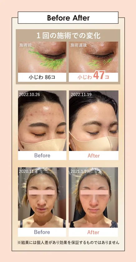 上:ベビースキン施術前後(40代)、 中/下:エステマシンでの施術と商品の飲用・使用による
