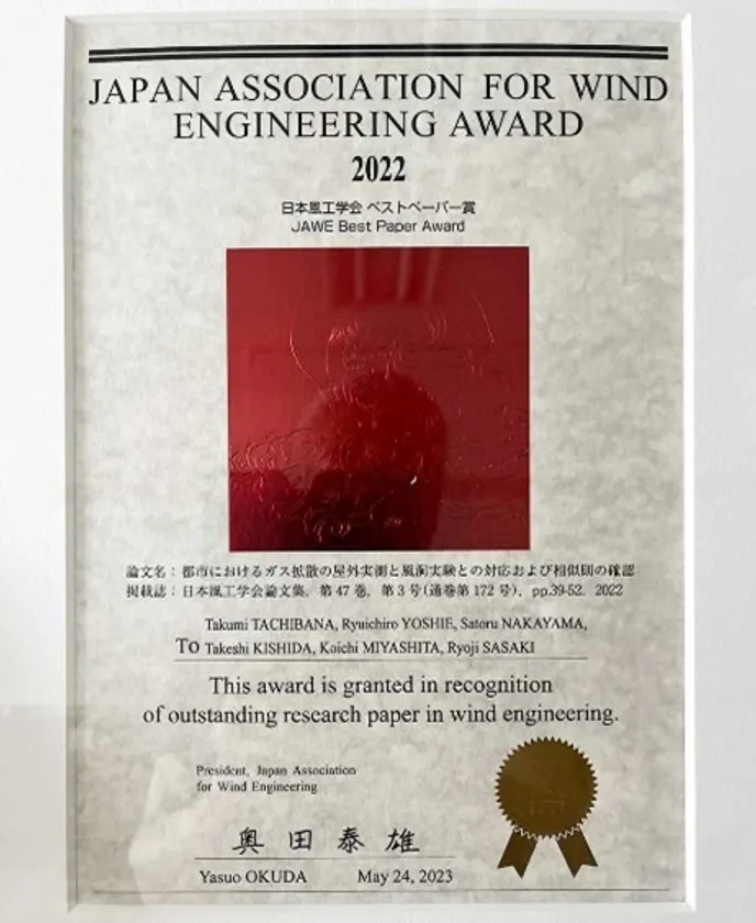 東京工芸大学大学院工学研究科 立花 卓巳さんらの論文が 日本風工学会ベストペーパー賞を受賞