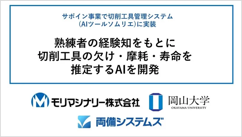 モリマシナリー株式会社(本社:岡山県赤磐市、代表取締役 森 郁夫、以下 モリマシナリー)は、国立大学法人岡山大学(本部:岡山県岡山市、学長 那須 保友、以下 岡山大学)、株式会社両備システムズ(本社:岡山県岡山市、代表取締役社長 松田 敏之、以下 両備システムズ)と共同で、戦略的基盤技術高度化支援事業(以下 サポイン事業〔※1〕)に採択された「熟練者の経験知からスマート工場化を実現する切削工具管理システム『AIツールソムリエ』」の開発を進めてきました。