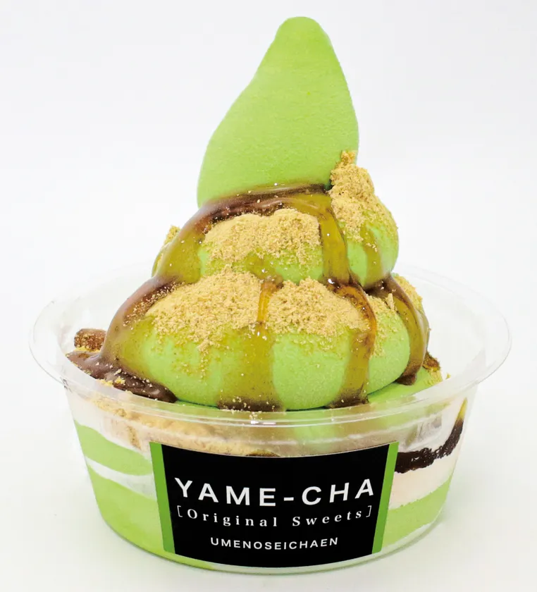 濃厚な香りの八女抹茶を使用したソフトクリームに、黒蜜きなこがけ。