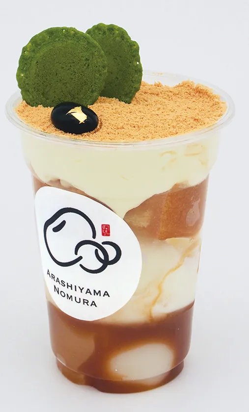 マスカルポーネクリーム・アイスに本葛餅や白玉、きな粉シロップが入った和のティラミスパフェ。トップには京きな粉に抹茶煎餅付き。