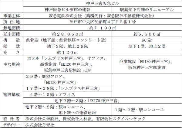 神戸三宮阪急ビルは、神戸阪急ビル東館の建替と駅高架下店舗のリニューアルにより、2021年4月26日に開業しました。商業施設「EKIZO(エキゾ)神戸三宮」やオフィス、宿泊主体型ホテル「レムプラス神戸三宮」などで構成されており、その概要は下表のとおりです。