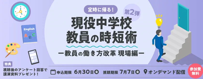 前回配信しました「多忙でも定時に帰り結果も出す!現役教員の時短術」ウェビナーに続き、「働き方改革」を実践している現役の中学校の先生をお招きし、実例を中心にお話ししていただきます。皆様の課題解決の糸口になれば幸いです。