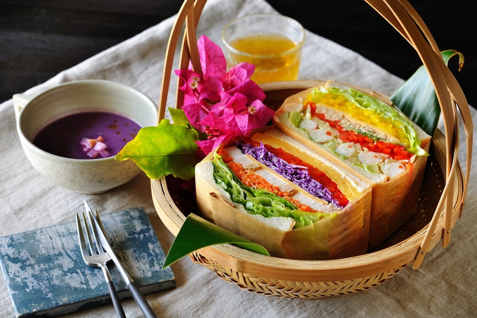 制作に没頭する日のランチは客室に用意します。ランチは、色彩豊かな春の自然のように、鮮やかな野菜をふんだんに使用したカラフルなサンドイッチとスープを味わいます。サンドイッチには、豚肉の煮込み料理「ラフテー」や「人参シリシリ」など沖縄で親しまれている料理も挟み込みました。海を望む客室のテラスのソファで味わえば、波音に癒されながらリフレッシュできます。